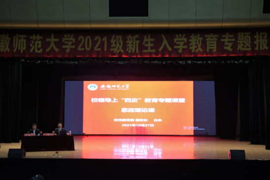 本网讯(新传学院 刘成俊)10月27日下午,校党委常委、副校长任永为新闻与传播学院、美术学院2021级新生讲授了一堂生动的“四史”教育专题课暨思政理论课。新闻与传播学院、美术学院党政领导班子成员、辅导员、全体新生共800余人聆听了本次课程。