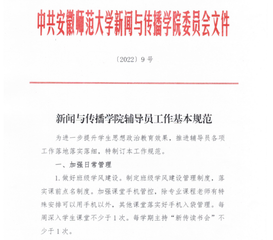 常态化提升辅导员职业能力。要给学生一杯水,教师要有一樽水。学院坚持将辅导员能力提升作为提升学生思想政治教育工作水平的前提,启动实施了辅导员能力提升计划。坚持把理论学习作为辅导员工作例会第一主题,安排辅导员轮流领学,着力聚焦学习习近平总书记关于教育的重要论述、马克思主义中国化相关理论、党的创新理论教育相关知识。注重辅导员实务能力培养,2021年9月以来,已邀请4位在全国全省辅导员职业能力大赛的获奖者为辅导员队伍传经送宝。学院坚持以制度化引领辅导员工作规范化,在深入学习研究《高等学校辅导员职业能力标准(暂行)》的基础上,结合学校、学院工作实际,制定实施了《新闻与传播学院辅导员工作基本规范》,从思想引领、学业管理、就业落实等方面,推进辅导员工作更深入更细致。