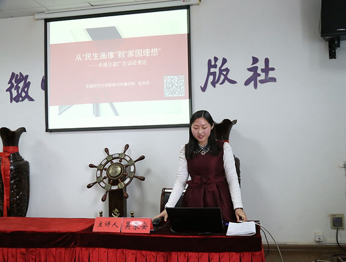 吴来安首先汇报了她的论文“从民生画像到家国理想:“央视公益广告”三十年话语变迁”。她从中央电视台在1987年开办的第一个公益广告栏目《广而告之》进行历史性梳理,指出了央视公益广告在其品牌建设的过程中经历了四个阶段,并总结央视公益广告在“广告主题、叙事风格和选材方式”三个维度发生了从“民生画像”到“家国理想”的巨大转变,进而讨论了央视公益广告品牌建设中的话语变迁。专家组肯定了其文章选题价值,表示论文层次清晰、表达准确,并就文章论与述、点和面、正和反、冷与热四个方面的关系处理方面给出了建议,同时指出,要注意主题与标题的处理,文章的用词与逻辑问题值得推敲。
