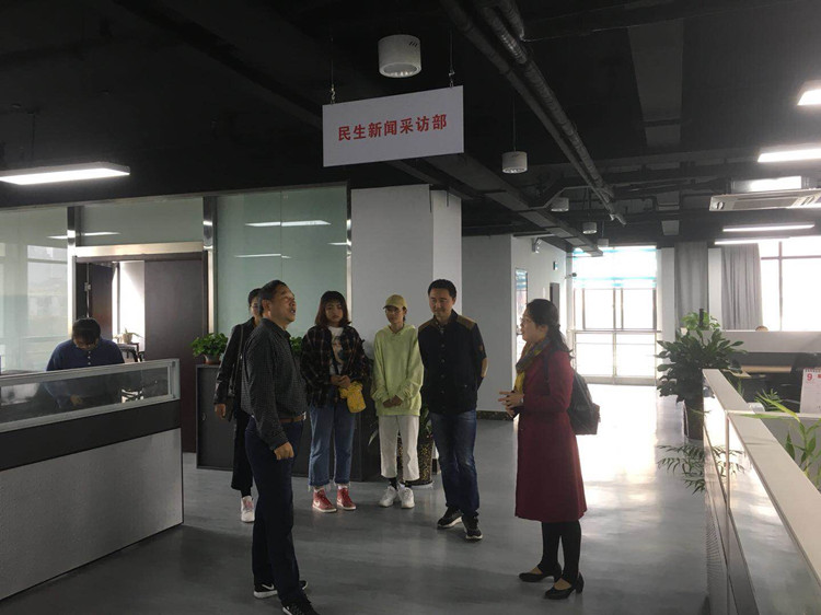 马梅一行首先看望了实习学生,然后师生一起在传媒集团相关人员的带领下参观了芜湖传媒集团的全媒体新闻中心,仔细了解了全媒体新闻中心的工作机制、管理制度、运行模式等方面的情况。
