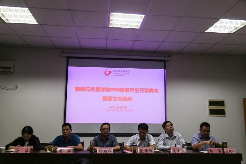 9月26日晚,新闻与传播学院2018级研究生开学典礼暨师生见面在新闻与传播学院四楼会议室举行。院党委书记张师帅,执行院长、博士生导师、戏剧与影视学硕士点负责人杨柏岭,部校共建副院长、新闻传播学硕士点负责人沈正赋,行政副院长周伍、教学副院长副院长马梅,全体硕士生导师及2018级硕士研究生参加了见面会。会议由科研与研究生副院长赵昊主持。
