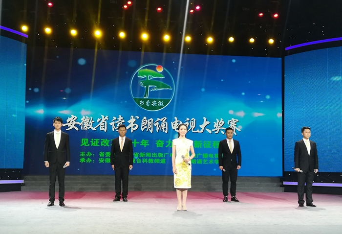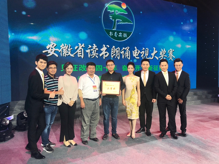书香致远展风采,改革康庄诵华章。9月29日下午,由省委宣传部、省新闻出版广电局、安徽广播电视台联合主办的“2018 安徽省读书朗诵电视大奖赛”总决赛,在安徽广播电视台1200平方米演播大厅举行。我校新闻与传播学院播音与主持艺术专业邵振奇、昌毅、王恒乾指导,李子涵、陶钧、徐淼、蒋雅文、贾号五位同学朗诵的作品《喊黄河——献给古老而又年轻的祖国》,代表省委教育工委参加比赛,以总决赛第二名的成绩荣获二等奖。