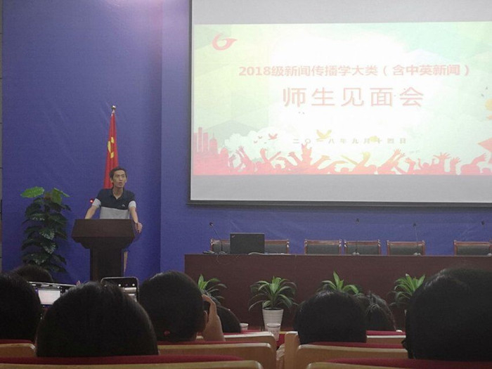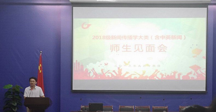 网络与新媒体专业教师们也于前日与新闻传播学类及中英新闻专业新生进行了交流。网络与新媒体专业负责人翟光勇与各位老师分别从个人经历、所授课程、对新生的寄语等方面进行分享和交流,翟光勇勉励新生们要多包容、多读书、多运动。