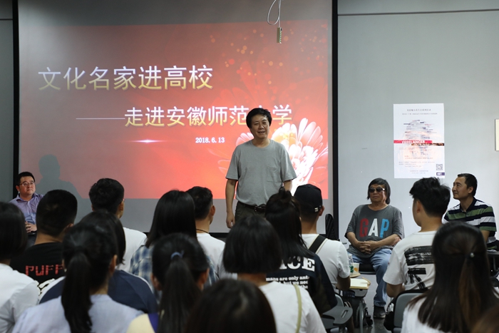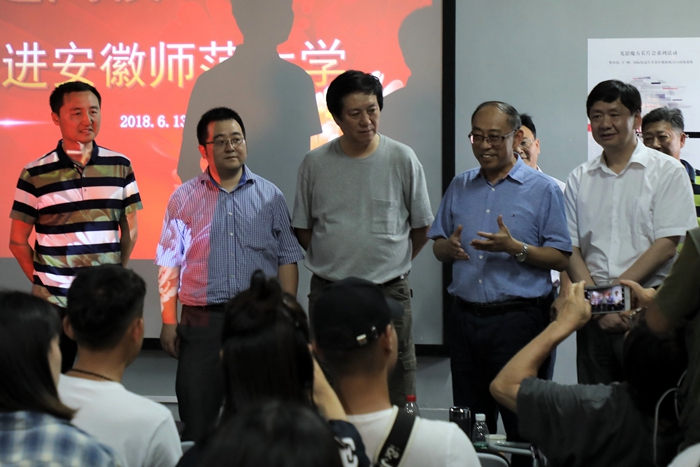 近日,由安徽省委宣传部、省委教育工委主办,省文联、安徽演艺集团、安徽师范大学共同承办的“文化名家进高校”活动在安徽师范大学全面展开。安徽省文联主席吴雪、省摄影家协会名誉主席徐殿奎、主席陈志勇、副主席乐卫星、办公室主任崇杲、合肥市摄影家协会副主席王岩、芜湖市文联主席韩东、市摄影家协会副主席奚邦祥、校党委宣传部部长、新传学院党委书记胡靖、宣传部副部长詹剑锋、校团委副书记刘长生等专家领导前往新闻与传播学院影视创作实验室开展摄影创作指导活动,活动由新传学院副院长赵昊主持,院党委副书记宋静、摄影专业负责人李化来及部分专业教师、各年级摄影学子共同到场聆听、交流。