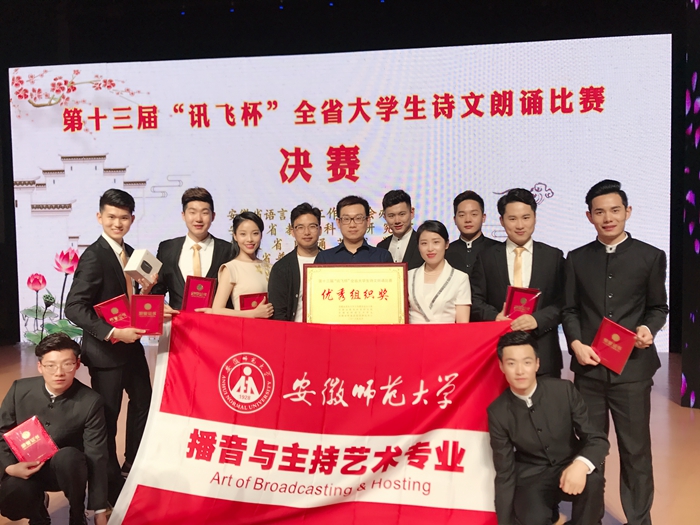 2018年5月26日,第十三届“讯飞杯”全省大学生诗文朗诵比赛决赛在安徽大学落下帷幕。由我校播音与主持艺术专业学子朗诵的作品《喊黄河——献给古老而又年轻的祖国》和《吊古战场文》获得总成绩前两名,分获专业组唯一一等奖和二等奖第一名,邵振奇、昌毅、方圆、王恒乾获优秀指导教师奖,我校获优秀组织奖。这是我校播音学子参加该项赛事七年来获得的第七个最高奖,充分体现出我校播音专业的办学成果和人才培养质量。