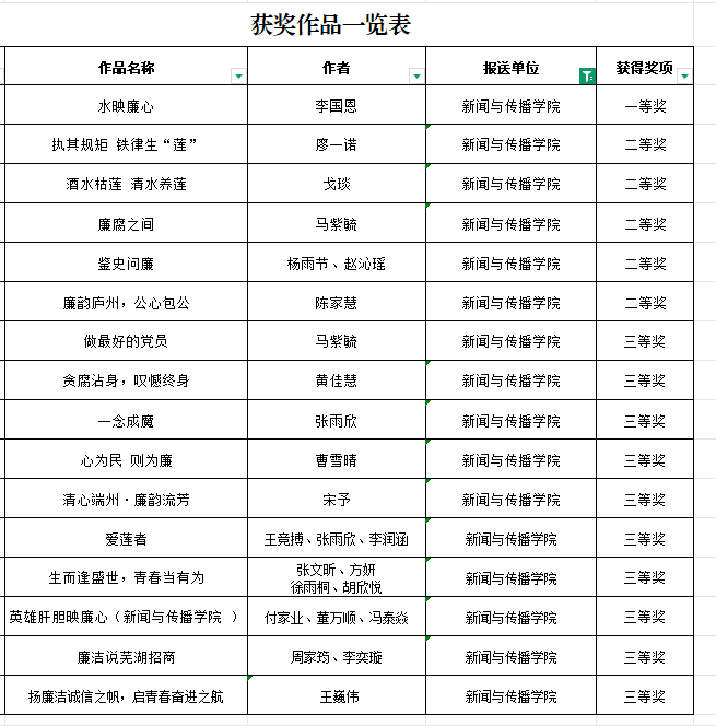 本网讯(新传学院纪委)近日,学校第一届新时代廉洁文化艺术作品征集活动结果公示,新传学院学子表现优异,获奖数量位居各学院首位,展现了学院在廉洁文化建设和艺术教育方面的深厚底蕴与活力。
