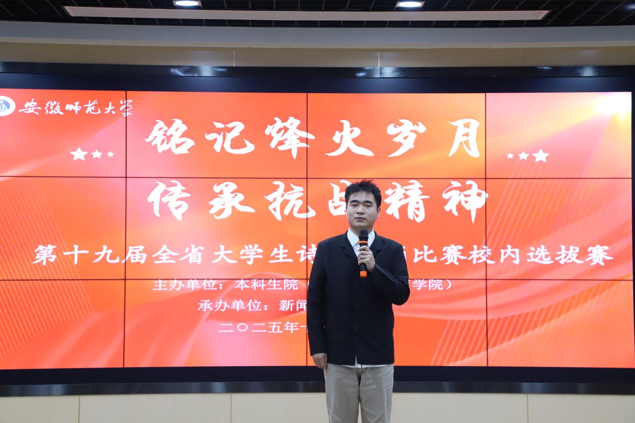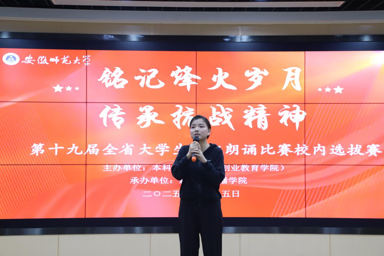 自赛事启动以来,各学院广泛动员、积极组织,学生踊跃参与、认真备赛。经过各院初选推荐,最终共有来自七个学院的十二组选手晋级校级选拔赛。本届比赛以“铭记烽火岁月,传承抗战精神”为主题,选手们以声寄情、以诵明志,通过一篇篇感人至深的作品,将现场观众带回到那段艰苦卓绝的救亡图存岁月。他们用声音再现历史,讴歌了永不褪色的民族气节与爱国情怀,充分展现了新时代青年铭记历史、砥砺前行的精神风貌。