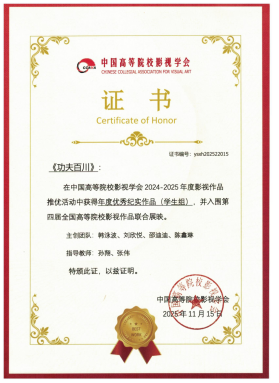 2025年11月15日,中国高等院校影视学会第二十五届年会暨第十八届中国高校影视学术论坛在厦门隆重举行。本届年会由中国高等院校影视学会与厦门大学联合主办,围绕“新征程·新使命:中国影视与文化强国建设”主题,深入探讨中国影视如何繁荣发展社会主义文化,扎实推进文化强国建设。我院2022级广播电视专业硕士研究生韩泳波创作的纪录片《功夫百川》荣获“年度优秀纪实作品(学生组)”,并入围第四届全国高等院校影视作品联合展映,作品创作指导教师孙翔受邀参会。