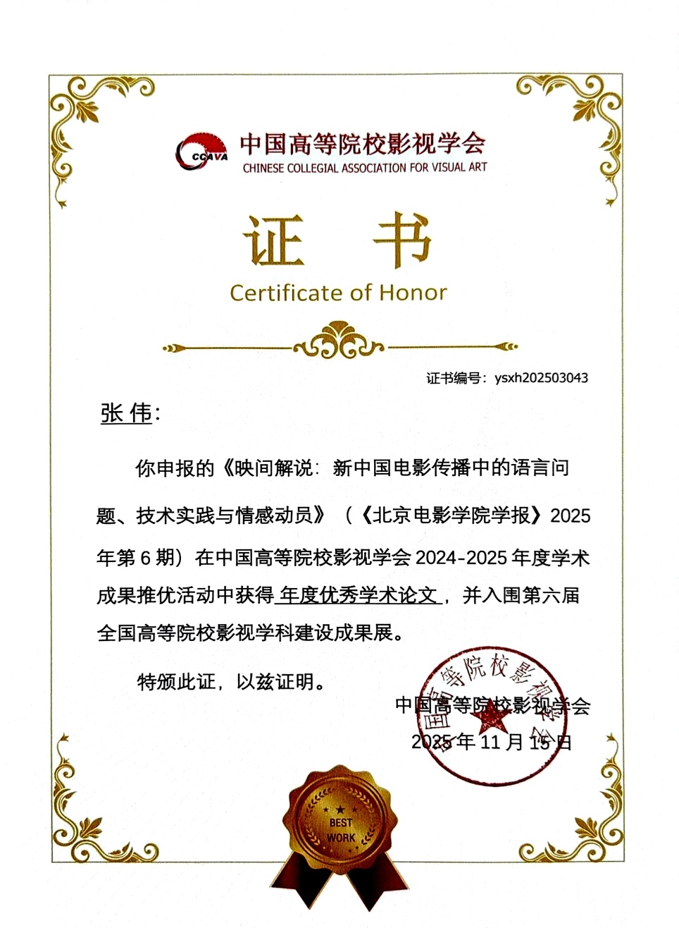 2025年11月15日,中国高等院校影视学会第二十五届年会暨第十八届中国高校影视学术论坛在厦门隆重举行。本届年会由中国高等院校影视学会与厦门大学联合主办,围绕“新征程·新使命:中国影视与文化强国建设”主题,深入探讨中国影视如何繁荣发展社会主义文化,扎实推进文化强国建设。我院影视摄影与制作专业青年教师张伟学术论文《映间解说:新中国电影传播中的语言问题、技术实践与情感动员》(原刊发于《北京电影学院学报》2025年第6期)在中国高等院校影视学会2024-2025年度学术成果推优活动中获得年度优秀学术论文,并入围第六届全国高等院校影视学科建设成果展。