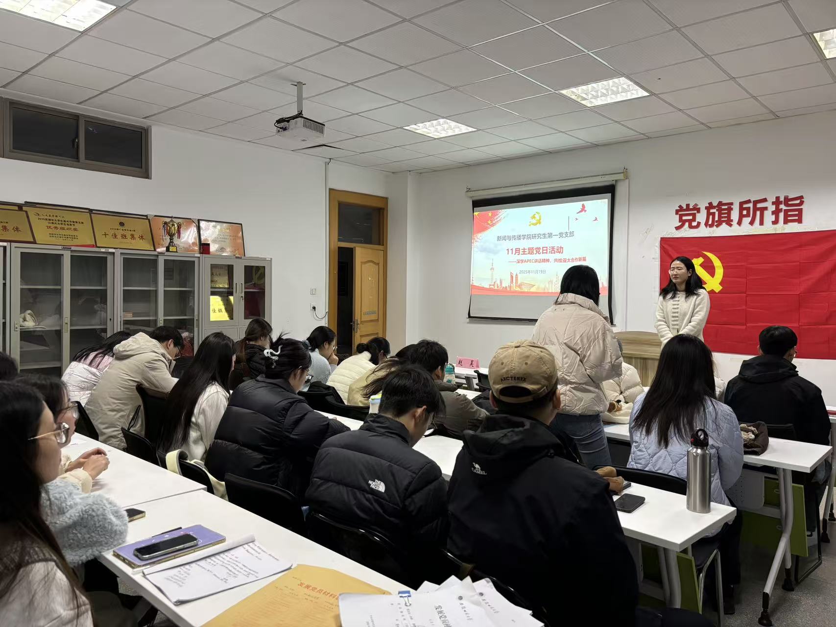 最后大会开展了“深学APEC讲话精神,共绘亚太合作新篇”的主题党日活动。党员们观看了习近平主席在APEC会议上的重要讲话,积极进行学习研讨。张雨欣谈到,习近平主席提出的“开放融通、绿色创新、普惠包容”理念让我深受触动。作为戏剧与影视专业研究生,我愈发清晰认识到,文艺是跨越国界的沟通桥梁,更是亚太人文合作的重要载体。邓多娇认为,中国—东盟戏剧周等实践正是开放融通的生动体现,优秀作品既要扎根本民族文化,也要拥抱多元交流,而绿色创新与艺科融合理念相契合,普惠包容则要求文艺创作贴近民众,未来将以纪实影像记录亚太各国普通人的奋斗与梦想,为构建亚太命运共同体注入文艺力量。