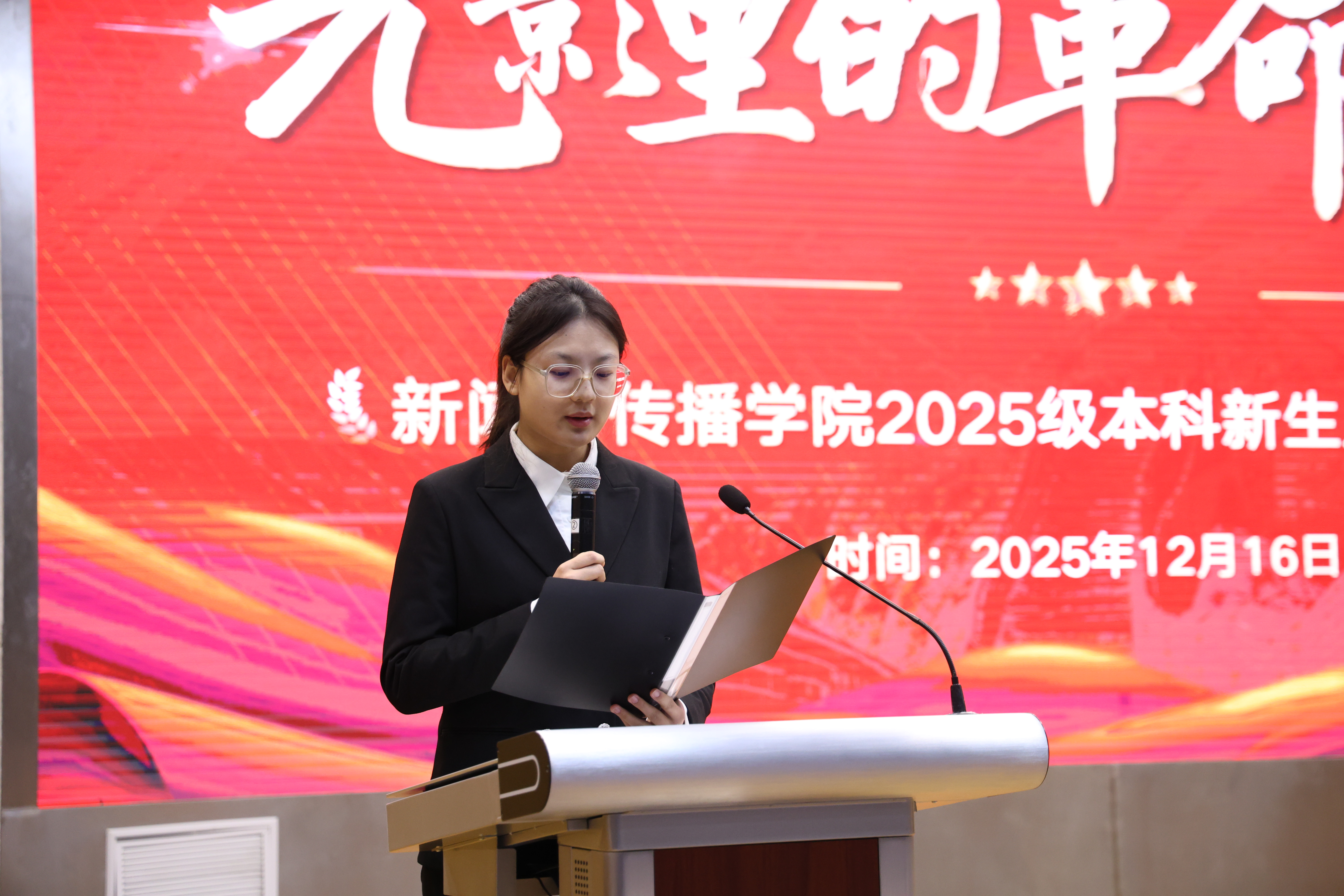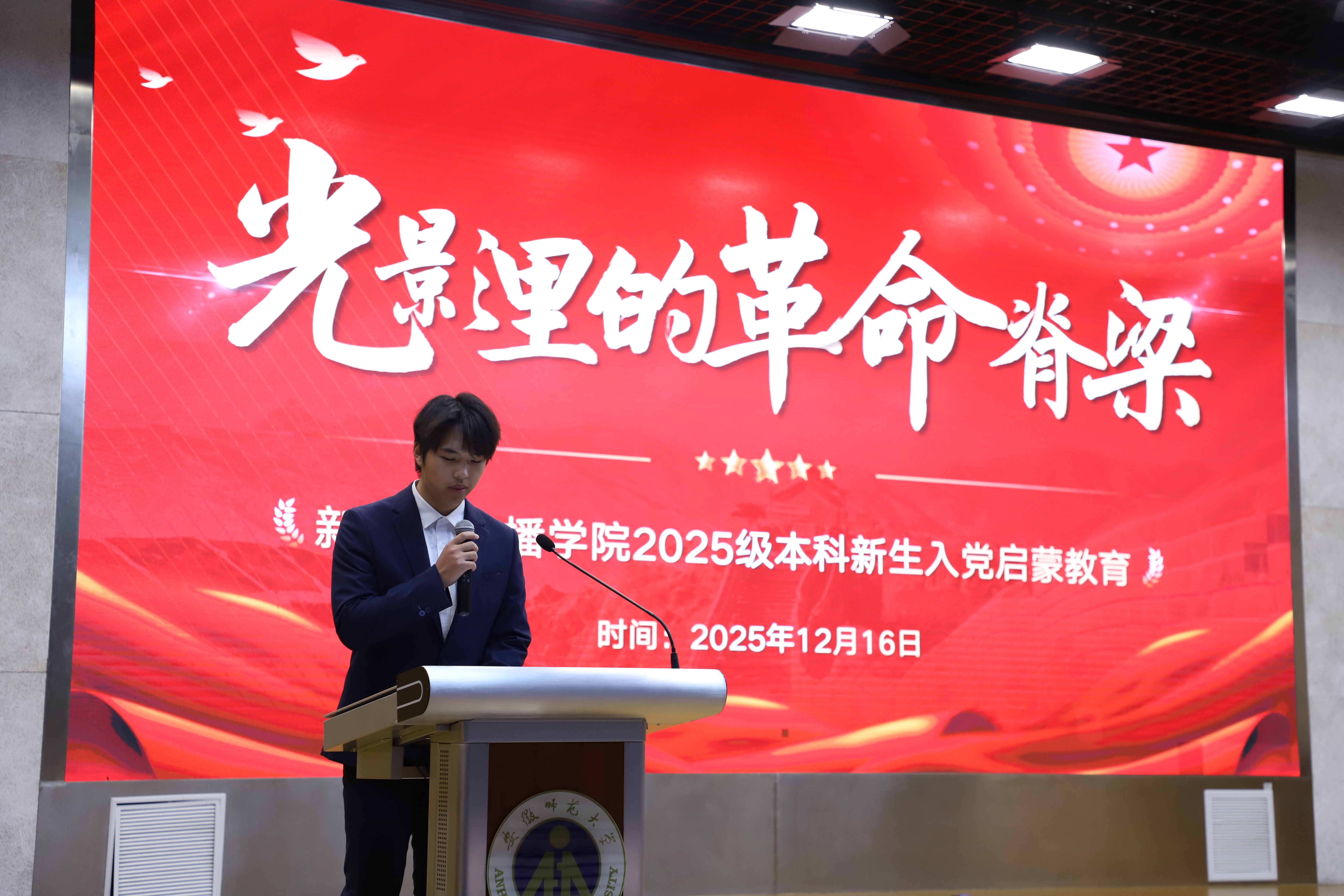 本网讯(新闻与传播学院 文/张傲雪)为加强2025级本科新生对中国共产党的认识、筑牢理想信念根基,12月16日晚7时,新闻与传播学院在理科大楼报告厅举办“光影里的革命脊梁——2025级本科新生入党启蒙教育”活动。院党委副书记吴青山、团委书记刘成俊、辅导员汪笑笑、郑慧玲、郭锦怡和第70期入党积极分子培训班全体学员、2025级全体本科新生参加了活动。活动由2022级播音与主持艺术专业学生党员叶凌志主持。