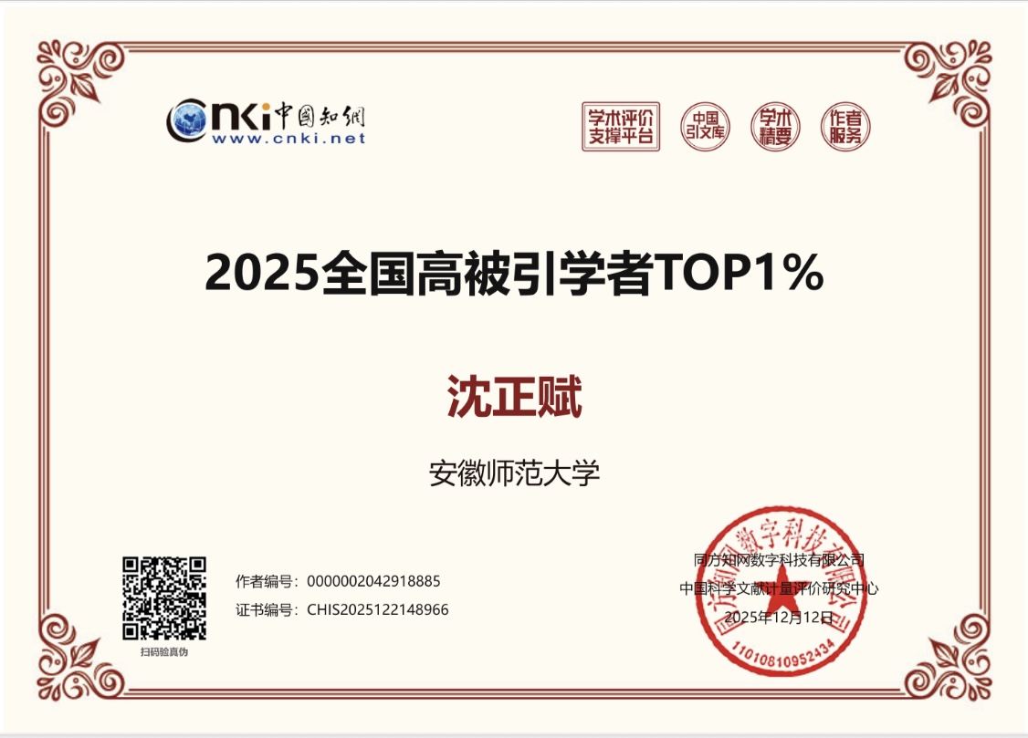 2025年12月12日,中国知网(CNKI)发布“2025全国高被引学者”名单。安徽师范大学沈正赋教授入选新闻传播学Top1%中国知网高被引学者名单,充分体现学院在学术研究、学科建设方面在全国的影响力。