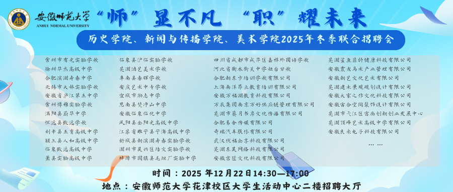 12月22日下午,新闻与传播学院与历史学院、美术学院在学校大学生活动中心就业招聘大厅共同举办2025年冬季联合招聘会。学院党委书记聂全高、执行院长马梅、党委副书记吴青山、副院长周伍、赵昊、秦枫等领导老师莅临现场,看望求职学生并与用人单位深入交流。
