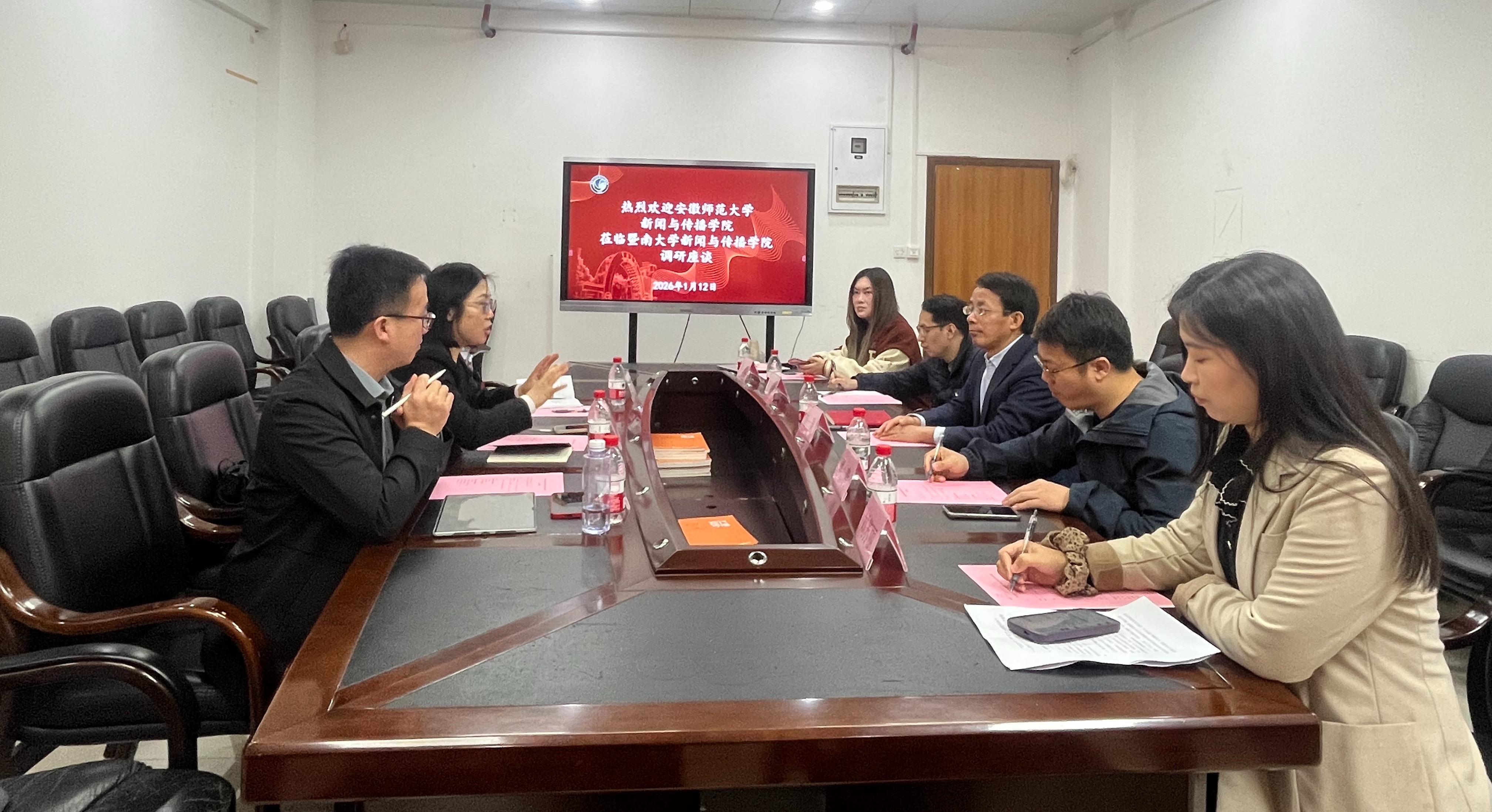 本网讯(新传学院)2026年1月12至14日,新传学院执行院长马梅一行,先后赴暨南大学、深圳大学开展调研,聚焦新闻传播教育在新时代的挑战与创新,与两所高校深入交流了学科建设、人才培养与实验室管理经验。
