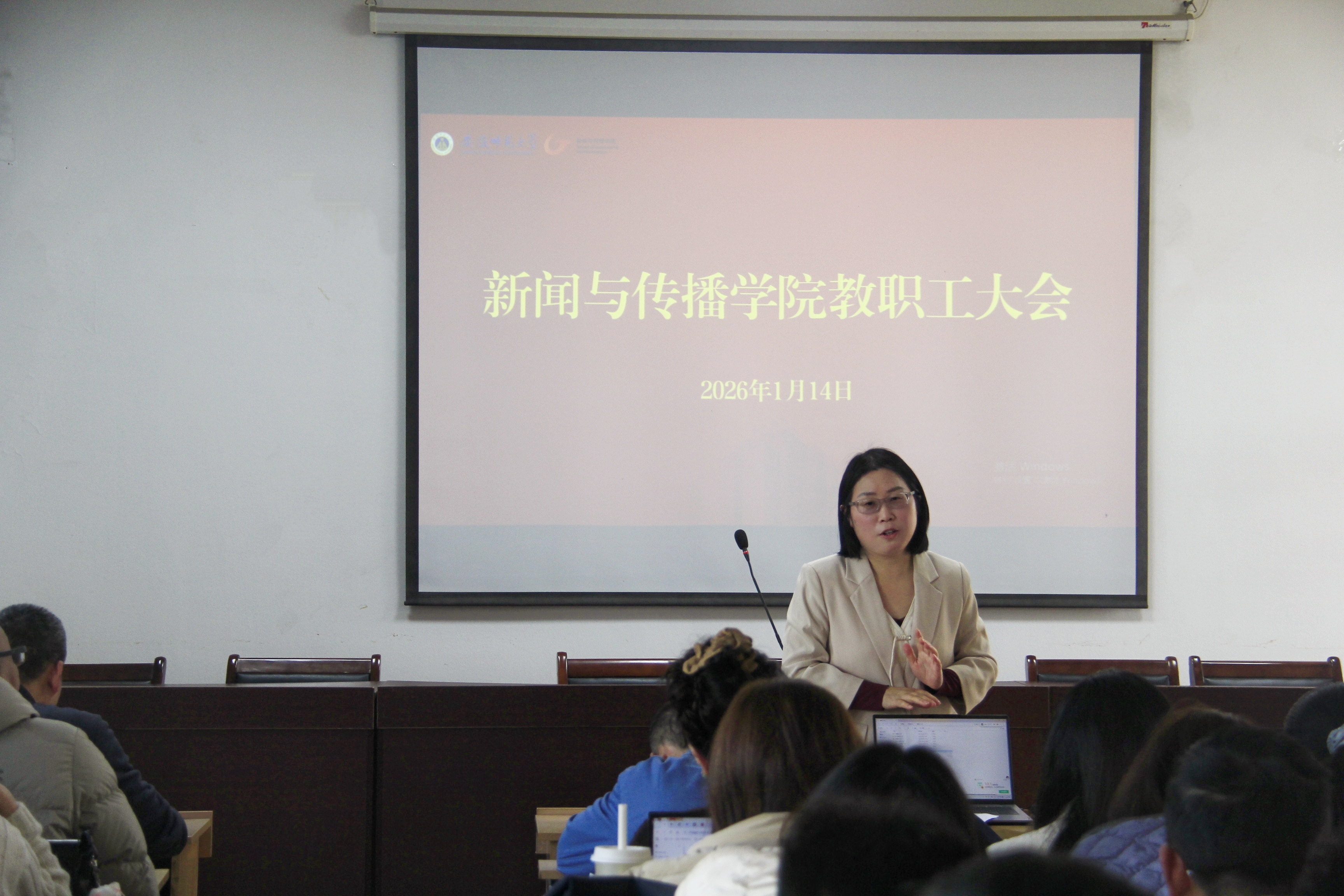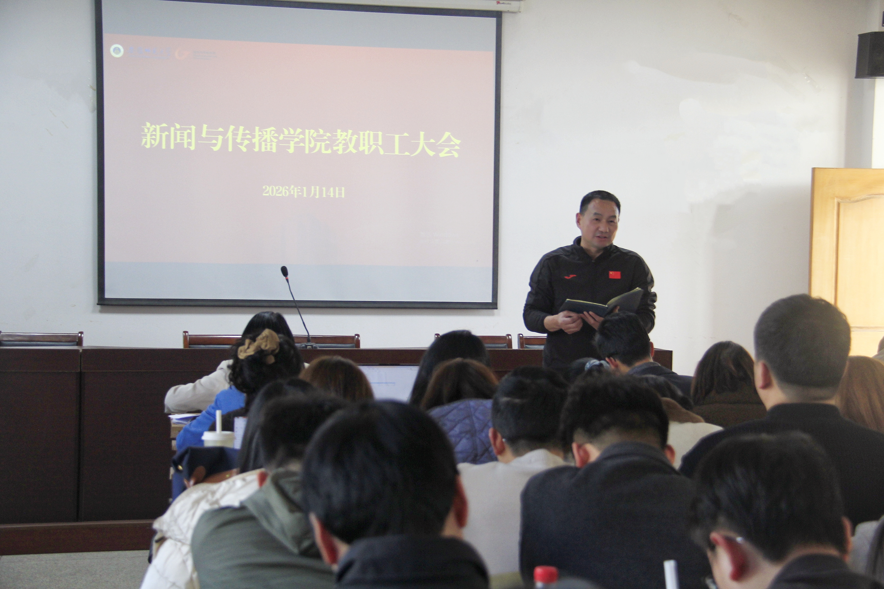 1月14日下午,新闻与传播学院在学院楼405会议室召开全院教职工大会。会议由学院党委书记聂全高主持,全体教职工参加会议。