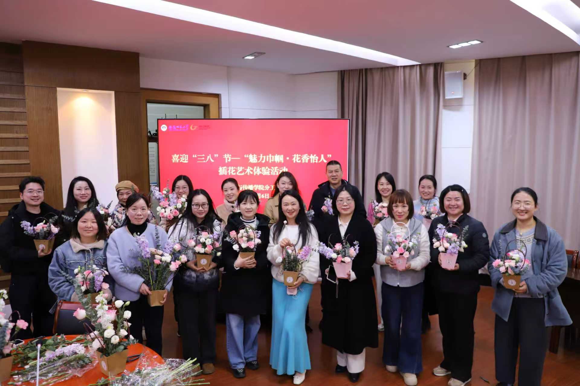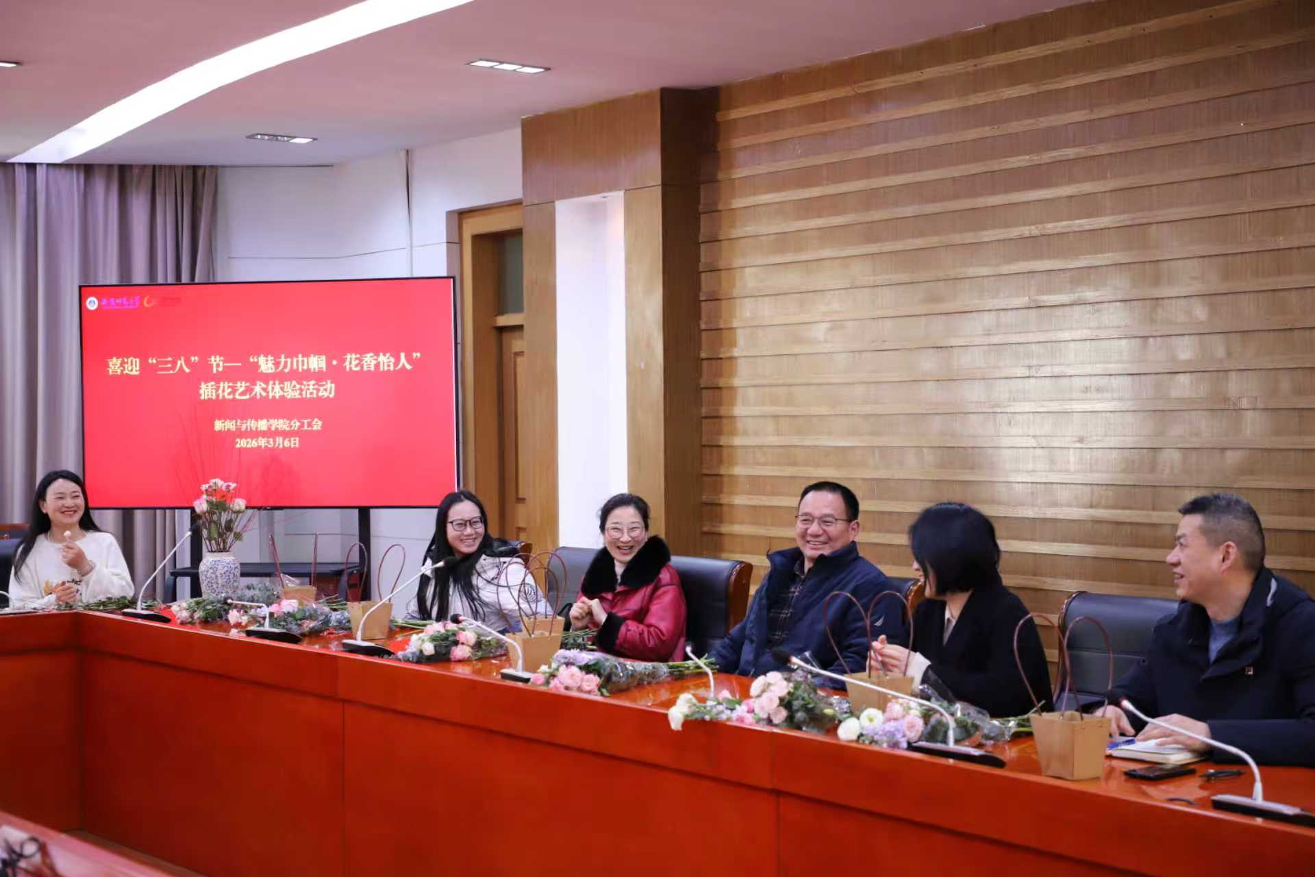 本网讯(新传分工会)为庆祝第116个“三八”国际妇女节,丰富女教职工的精神文化生活,提升艺术修养与审美情趣,3月6日下午,新闻与传播学院分工会在圆形报告厅一楼会议厅举办了“喜迎三八节·魅力巾帼 花香怡人”插花艺术体验活动。学院党委书记聂全高,执行院长马梅,分工会主席、副院长周伍出席活动。活动由学院分工会副主席张泉泉主持。