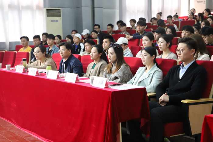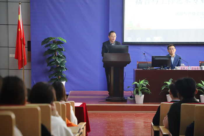 最后,院长杨柏岭教授代表学院发表了热情洋溢、饱含深情的动员讲话。他首先肯定了播音专业所取得的成绩,并对专业未来的发展提出殷切希望。杨柏岭指出,我院播音专业自2010年招生以来,一直以昂扬之姿,奋进之态,诠释着一种别样的风采。凭借多年的努力,业已形成较为鲜明的办学特色,以及内外兼修的专业人才培养规格。师生们应将这种规格不断传承、塑造、展示。杨柏岭进而从艺术审美的高度对比赛及展演进行了动员。他指出,诗文朗诵是一次艺术创造与传播活动,应通过我们的“二度创作”,引导听众赏作品之善,寻作品之真,品作品之美。唯有通过持之以恒的技能训练,方可在展示时不露痕迹,以达到“道”的境界。他强调,展演及比赛,既是目的,更是过程与手段。希望各位同学在指导教师的带领下,认真并完美地走完这个过程。最后,杨柏岭向师生提出了如何实现人生价值的命题,他勉励全体师生,要树立理想、点燃希望,并付诸于行动,不断改变自己、提高自己、谋求发展,成为一个有故事也能给他人带来故事的人。会场气氛热烈,不时响起热烈的掌声,拳拳之心、殷殷之情更令全体师生备受鼓舞。