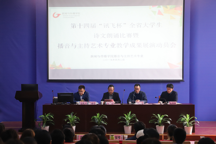 2019年4月3日下午2:30,第十四届“讯飞杯”全省大学生诗文朗诵比赛暨播音与主持艺术专业教学成果展演动员会于安徽师范大学行知楼一号楼307报告厅举行。校教务处副处长、创新创业教育学院副院长李汪根、新闻与传播学院党委书记张师帅、院长杨柏岭、播音与主持艺术专业教师、辅导员与全体同学参加了会议。会议由播音与主持艺术专业负责人邵振奇主持。
