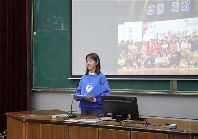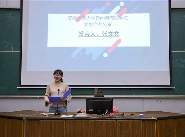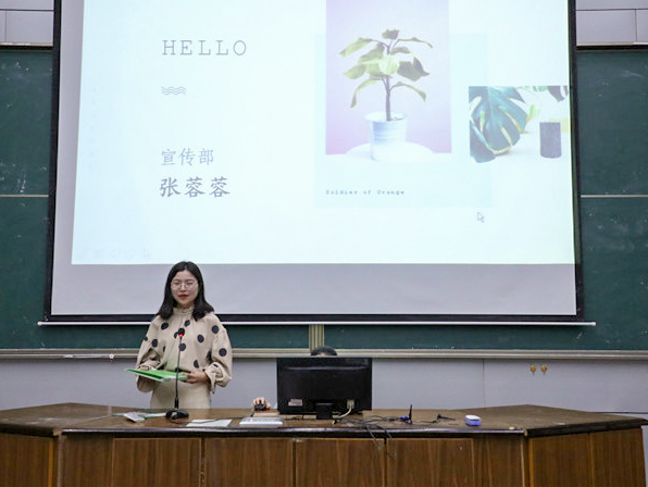 副主席曹寅飞代表主席团发言,他从新生入学开始说起,将学生会成员半年的成长历程以一幅时间卷轴的方式徐徐展开。他将新传学院第九届学生会比作一棵大树,在长达281天的日子里,每一个活动都见证着学生会成员的成长,曹寅飞希望学生会每位成员都能乘风飞翔,最终成长为参天大树。
