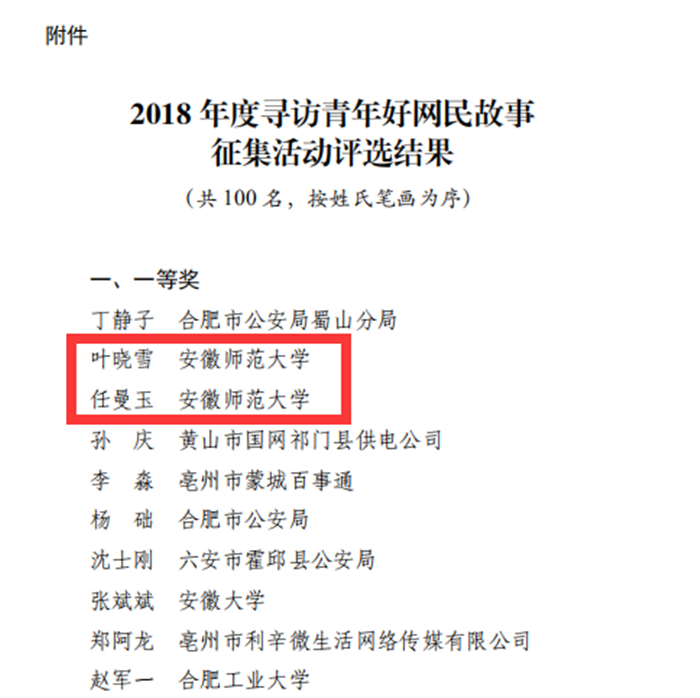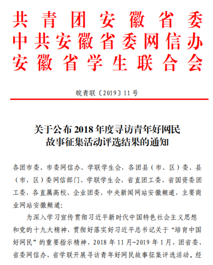 2月27日,共青团安徽省委、中共安徽省委网信办及安徽省学生联合会共同发布了《关于公布2018年度寻访青年好网民故事征集活动评选结果的通知》,其中,新传学院2017级网新专业叶晓雪、2016级新闻专业曹寅飞和2017级网新专业赵柳明同学分别获得一、二、三等奖。