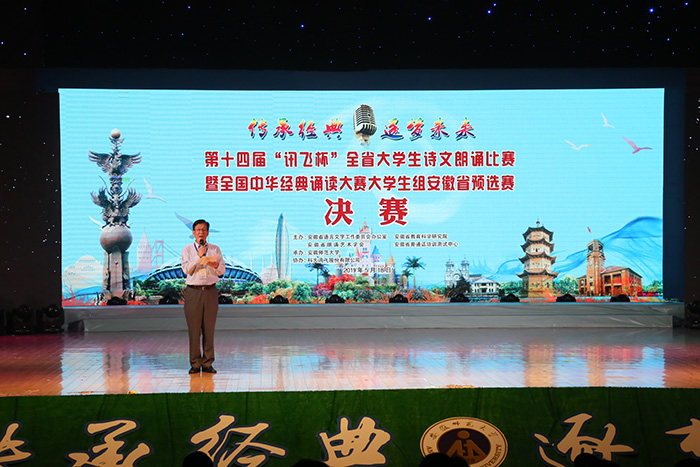 5月18日,第十四届“讯飞杯”全省大学生诗文朗诵比赛决赛暨全国中华经典诵读大赛大学生组省级决赛在安徽师范大学花津大剧院举行。本届“讯飞杯”由安徽省语言文字工作委员会办公室、安徽省教育科学研究院、安徽省朗诵艺术学会和安徽省普通话测试培训中心主办,由安徽师范大学承办,科大讯飞股份有限公司协办。安徽省语言文字工作委员会办公室副主任李敏、安徽省普通话培训测试中心副主任单明、安徽师范大学副校长陆林出席大赛现场,来自包括安徽师范大学以及省内其他参赛高校的七百余名师生观看了比赛。
