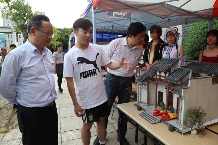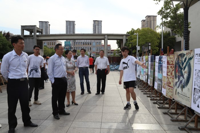 动画专业现场展示了动画专业学子花费三周时间制作的手工作品,做工精良,吸引大量学生观赏,同时展示cosplay。学院领导对动画专业学子认真踏实的学习态度和丰富的创造力给予了高度赞扬。在实践教学成果汇报展中,动画专业也是硕果累累,创意不断。《竹山书院》利用数字交互技术,让用户在虚拟场景中了解徽州建筑的独特韵味,在第十届中国大学生计算机设计大赛中获省级一等奖,国家级二等奖;《厉害了我的国》以中国近年来标志性成果为对象,幻化为马、鹤、鱼等形象,创意无限,获得第九届全国大学生广告艺术大赛省级一等奖,国家级优秀奖。在观展过程中,在张师帅、杨柏岭等与同学们一起沟通交流,询问创意来源灵感,对作品表达了高度肯定并建议学院各专业之间要多交流多学习,创新思维提升能力,共同进步。