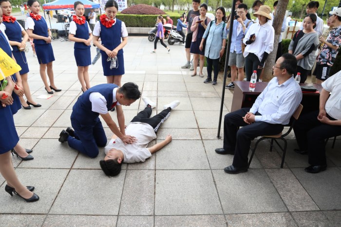 “砥砺奋进的这七年,欢迎来到新传航班”。空乘学子们身着专业服装,回顾了近七年来不懈拼搏并终有成就的点点滴滴。为更加直观地展示专业能力,他们还利用模型向老师和同学们演示了如何进行“空中急救”。