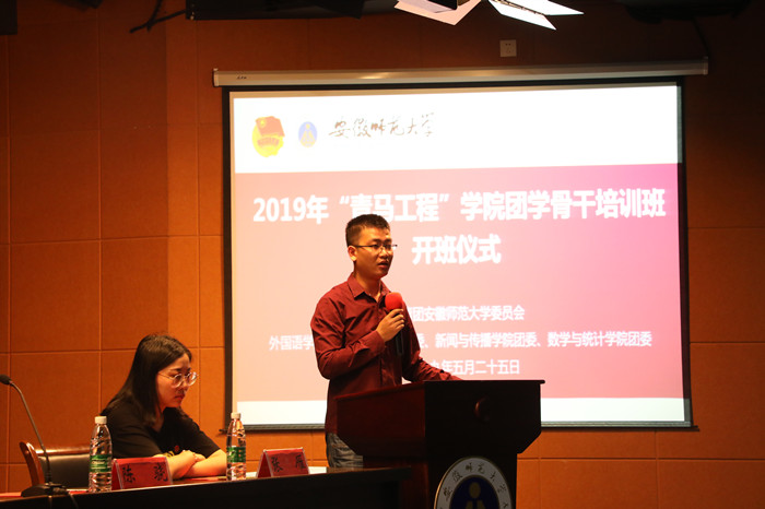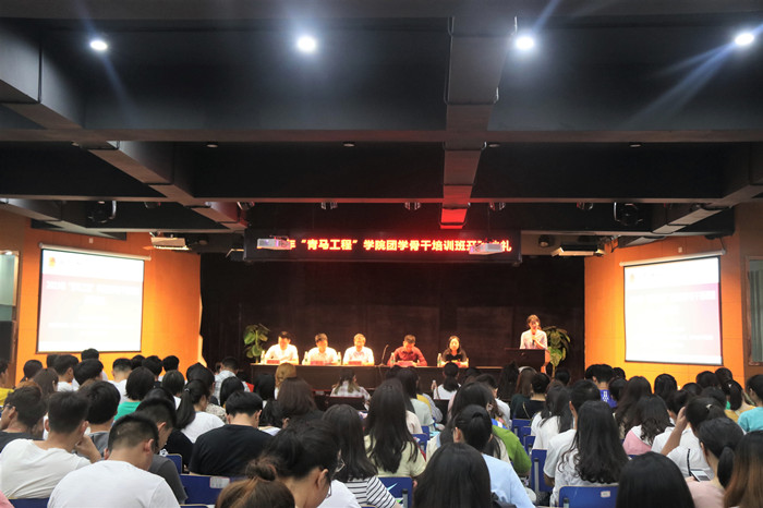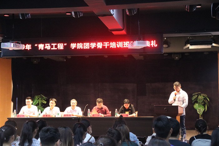5月25日上午,为加强学生组织干部队伍建设,切实推进学生会组织和学生社团中青年马克思主义者的培养,新传学院联合其他兄弟学院一起在大学生活动中心二楼团委多功能厅成功举行2019年“青马工程”学院团学骨干培训班开班典礼。马克思主义学院教授路丙辉、校团委组织部部长陈骁、外国语学院团委书记李昂、新闻与传播学院团委书记张雁、数学与统计学院团委书记张春光、体育学院团委副书记张学谦,以及此次培训班成员共同参加。开班仪式由李昂主持。