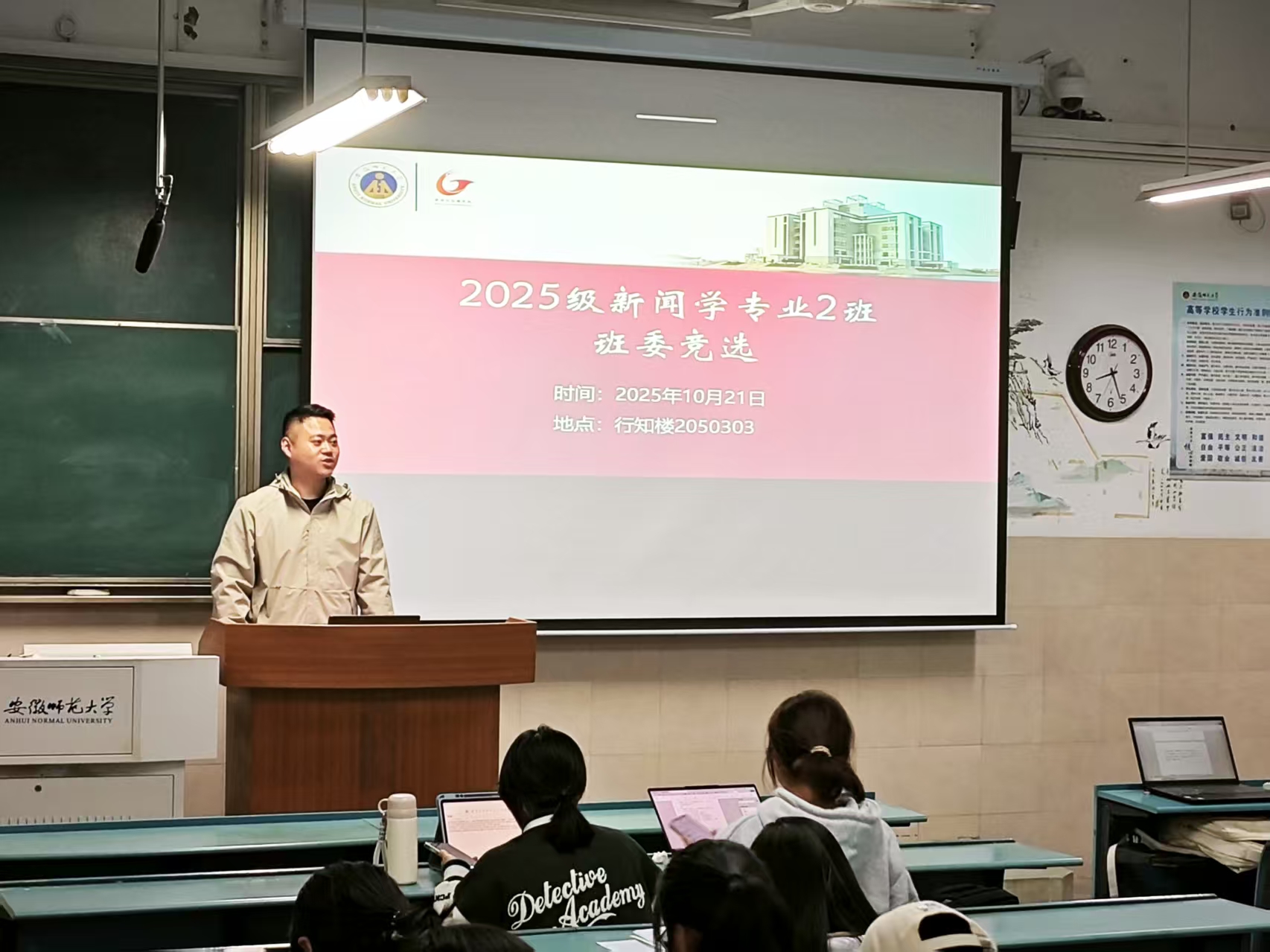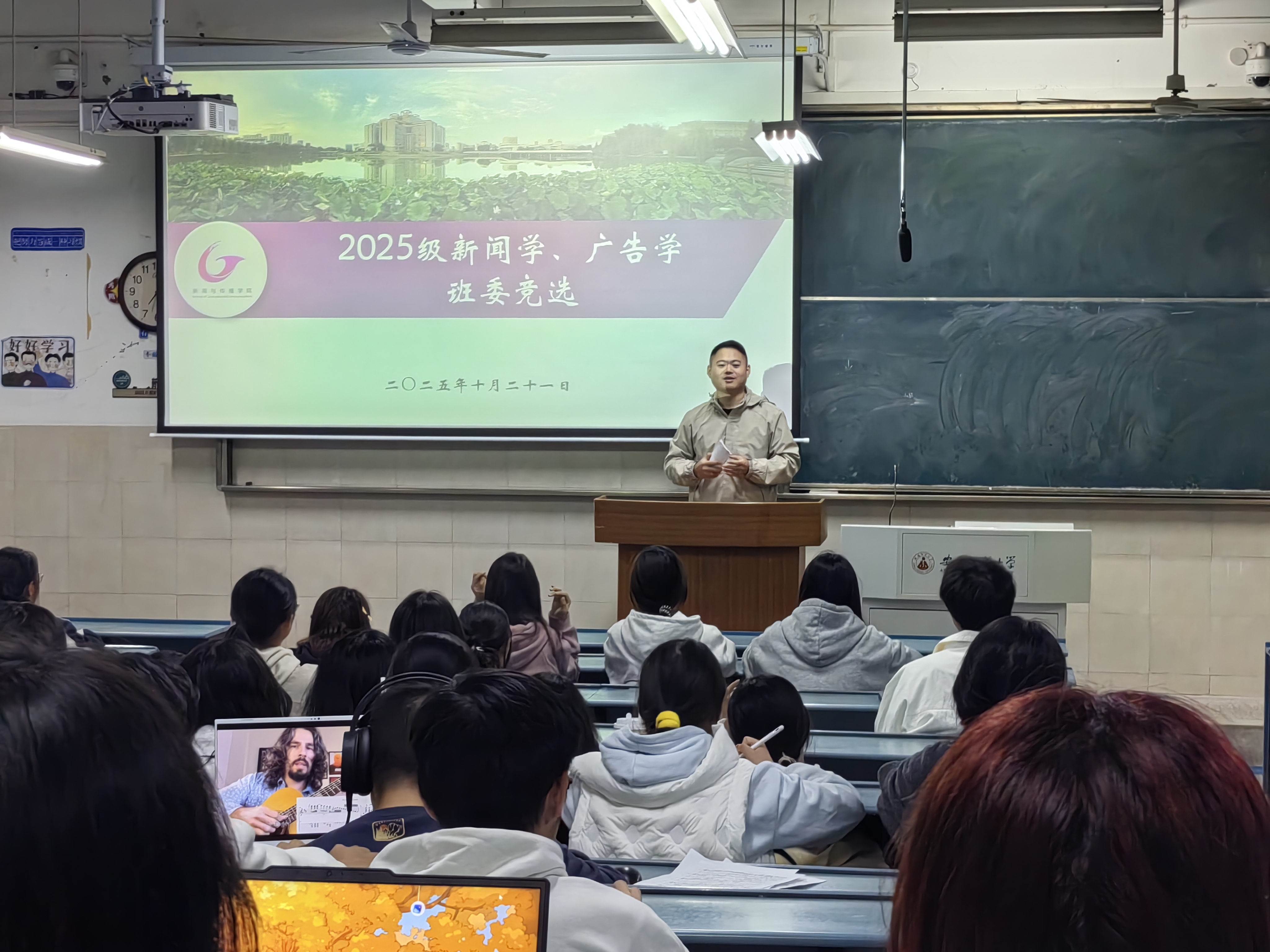 本网讯(新闻与传播学院 刘成俊)为做好班级建设工作,2025年10月21日晚,2025级新闻学、广告学分别于行知楼教室开展班委选拔工作,活动由辅导员刘成俊主持。