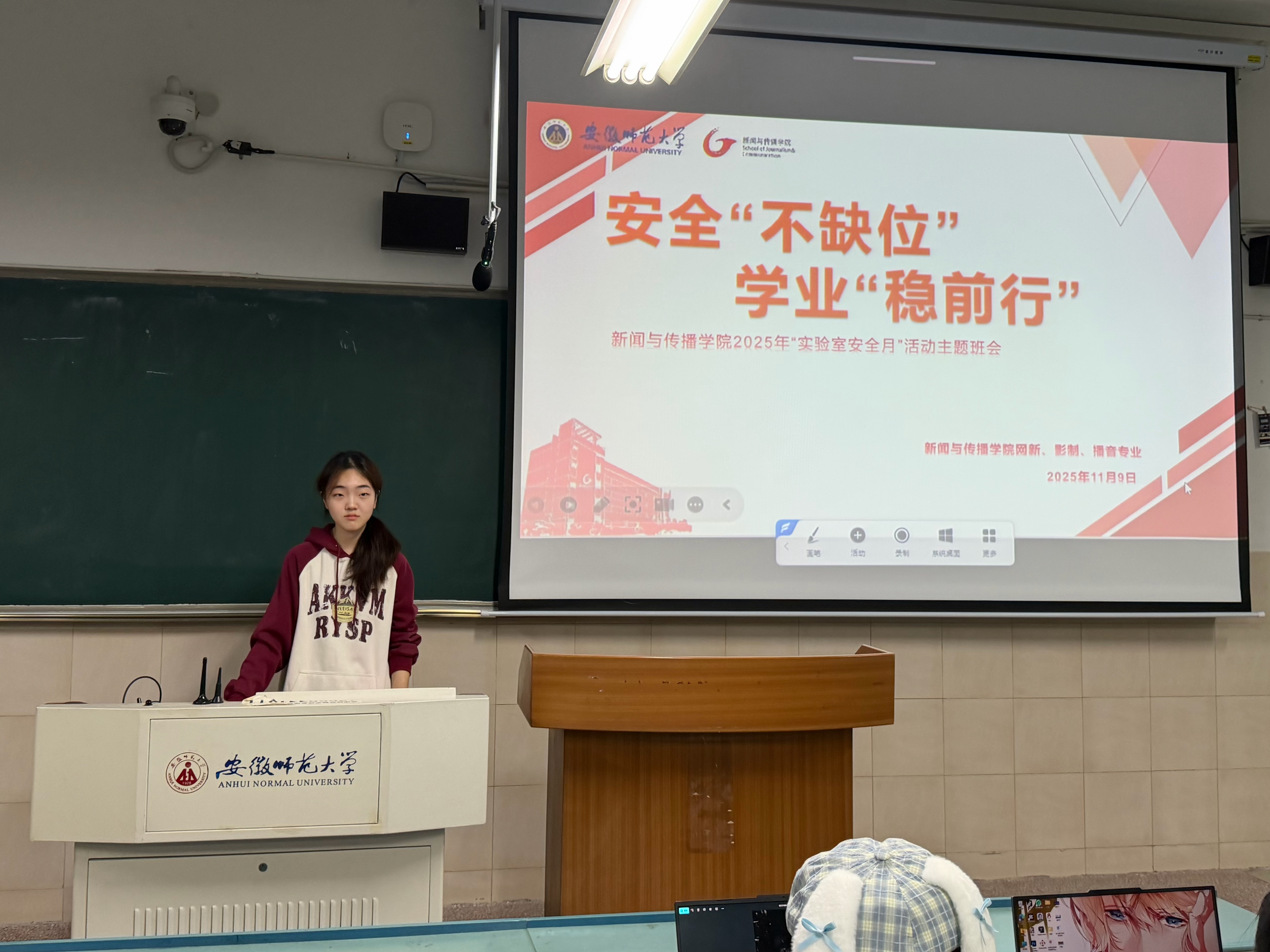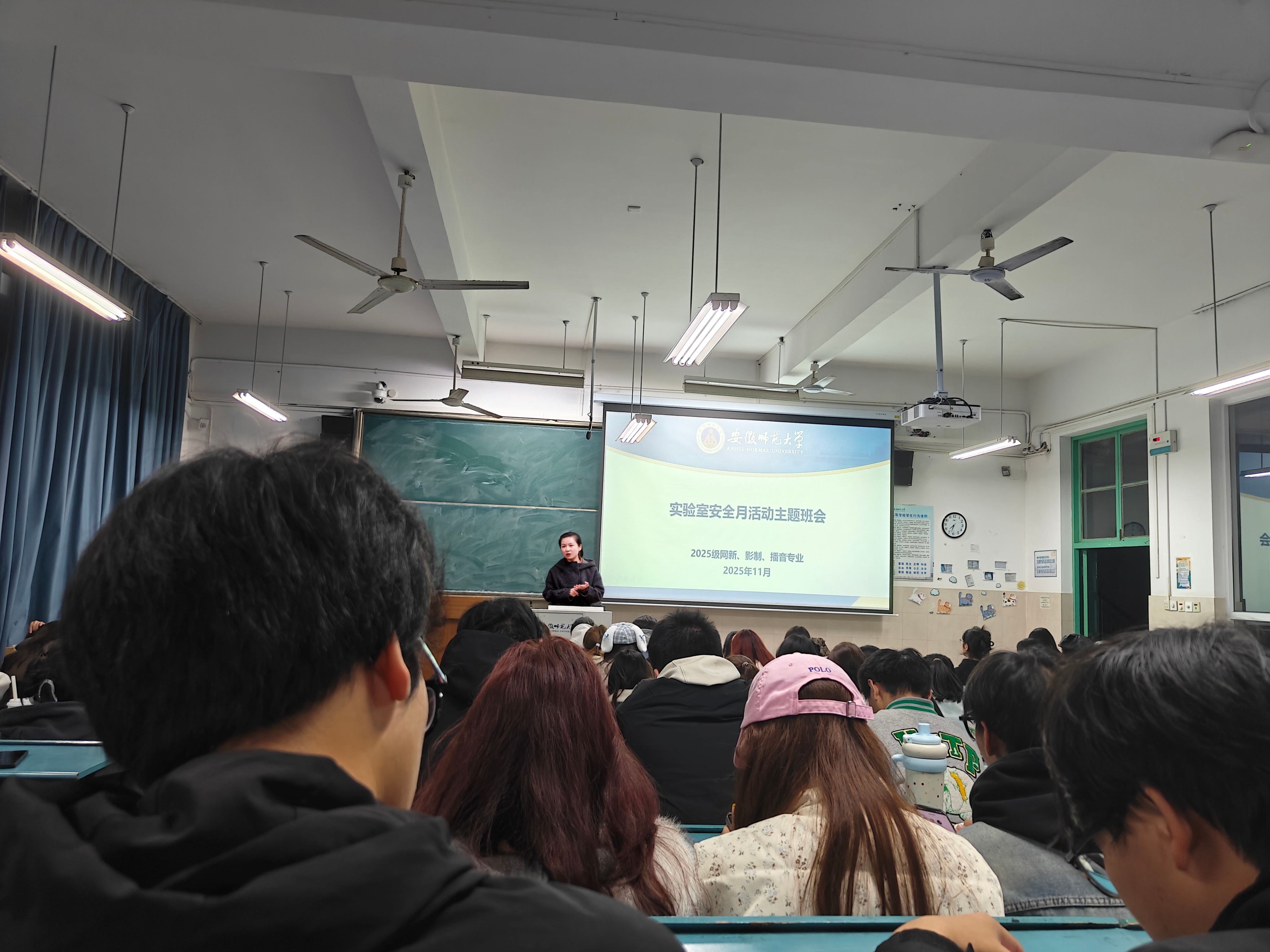 本网讯(新闻与传播学院 文/杨佳琪 蒋祐琪 张卿 图/杨佳琪、唐越)为增强师生安全意识,提升其在实验室内应对突发安全事故的能力,2025级网络与新媒体、播音与主持艺术、影视摄影与制作专业全体同学11月以来扎实开展了“实验室安全月”系列活动,通过“主题班会+实地参观+安全教育+准入考试”的形式,构建高效、科学、有序的实验室安全教育体系,为学院教学、科研及学生实践工作保驾护航。