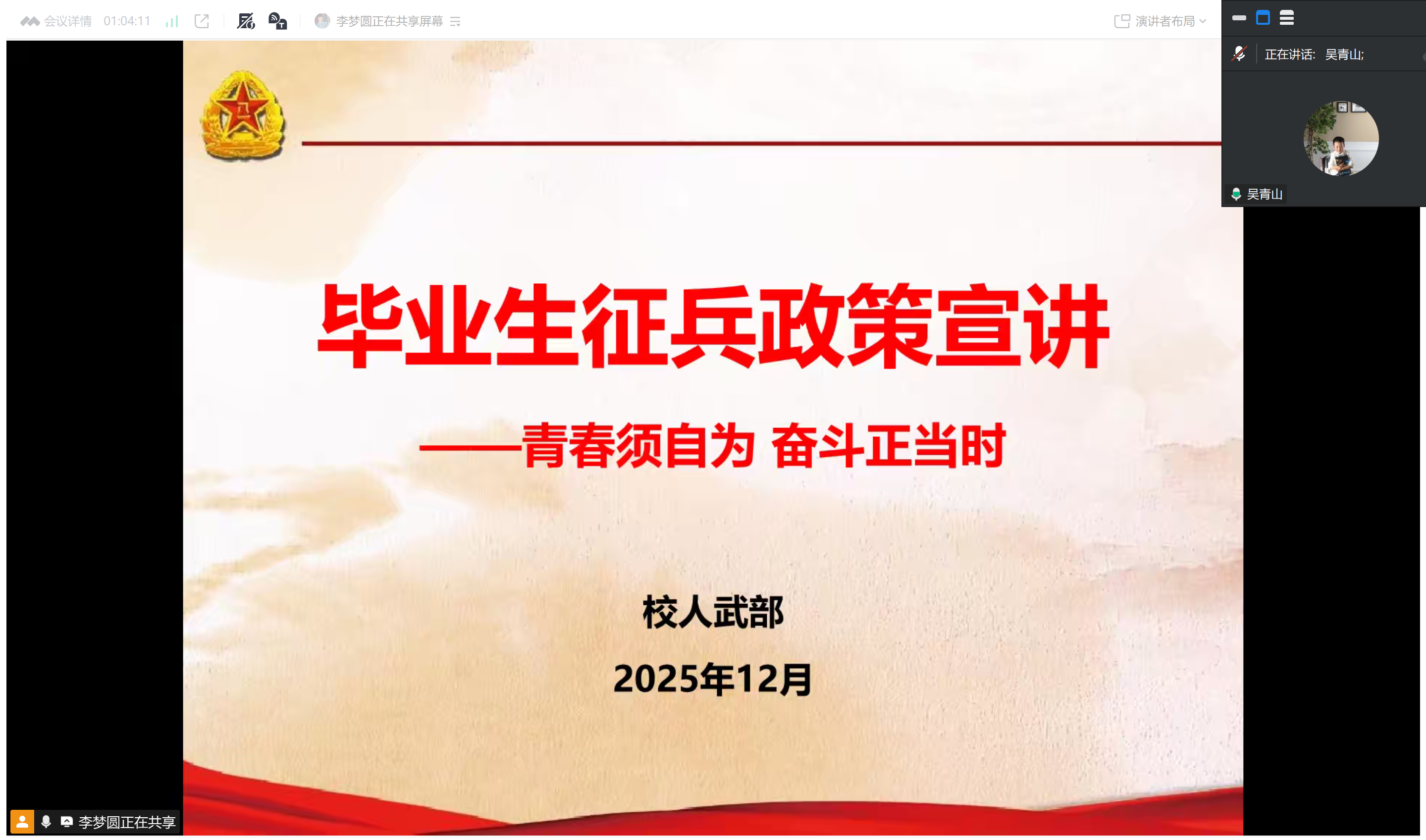 吴青山强调:希望同学们结合自身实际,做出适合自己的选择。同时,也鼓励有志于投身国防事业的同学积极响应国家号召,把握应征入伍的宝贵机会。学院将全力支持同学们的成长与发展,为大家的未来保驾护航。(文/张程宏 图/马文雅)