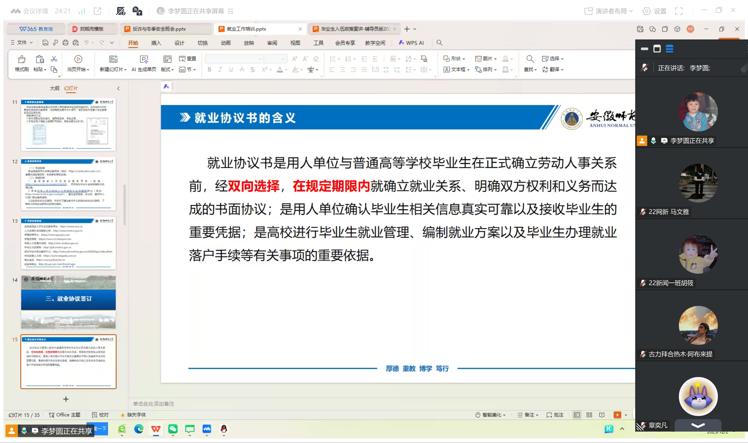 李梦圆围绕求职准备、就业协议签订、毕业去向登记及招聘系统操作四大板块展开,指导学生如何填写就业推荐表,利用国家大学生就业服务平台等渠道获取招聘信息,并演示了通过微信小程序“安徽24365大学生就业服务平台”网签就业协议及毕业去向登记的全流程。特别是针对签订就业协议、劳动合同、升学等12种毕业去向分类及其证明材料要求作了详细说明,强调准确填写生源所在地等重要信息关乎档案转递。