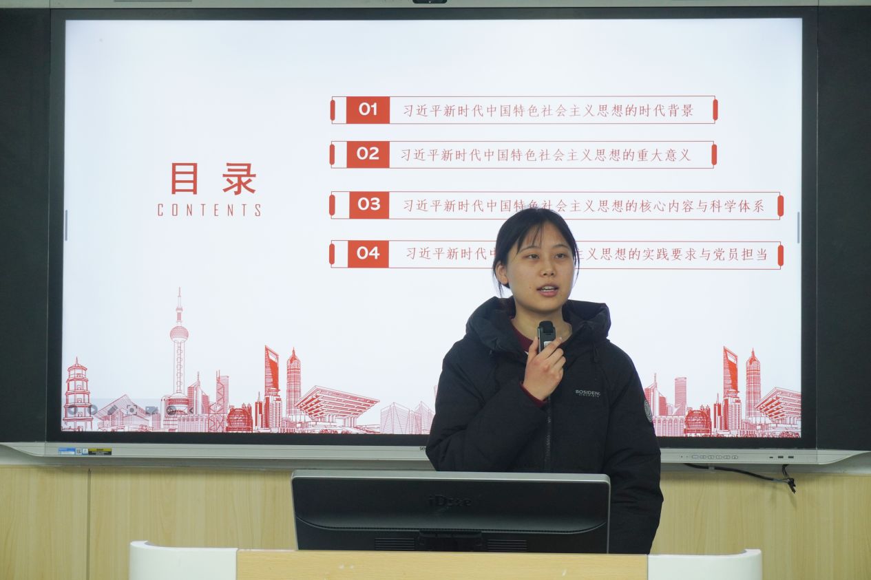 随后,李雪、王宇同志分别进行领学。李雪以“思想领航,奋进新时代”为核心,从时代背景、重大意义、核心内容与科学体系、实践要求与党员担当四个方面带领全体党员深入学习贯彻习近平新时代中国特色社会主义思想。王宇同志以“历史变革中的安徽:徽风皖韵,红色传承”为题领学,通过丰富的史料、鲜活的案例,展现了安徽大地深厚的红色底蕴与不朽的精神力量,强调青年党员要从地方红色历史中汲取智慧,将家国情怀融入新时代奋斗征程。