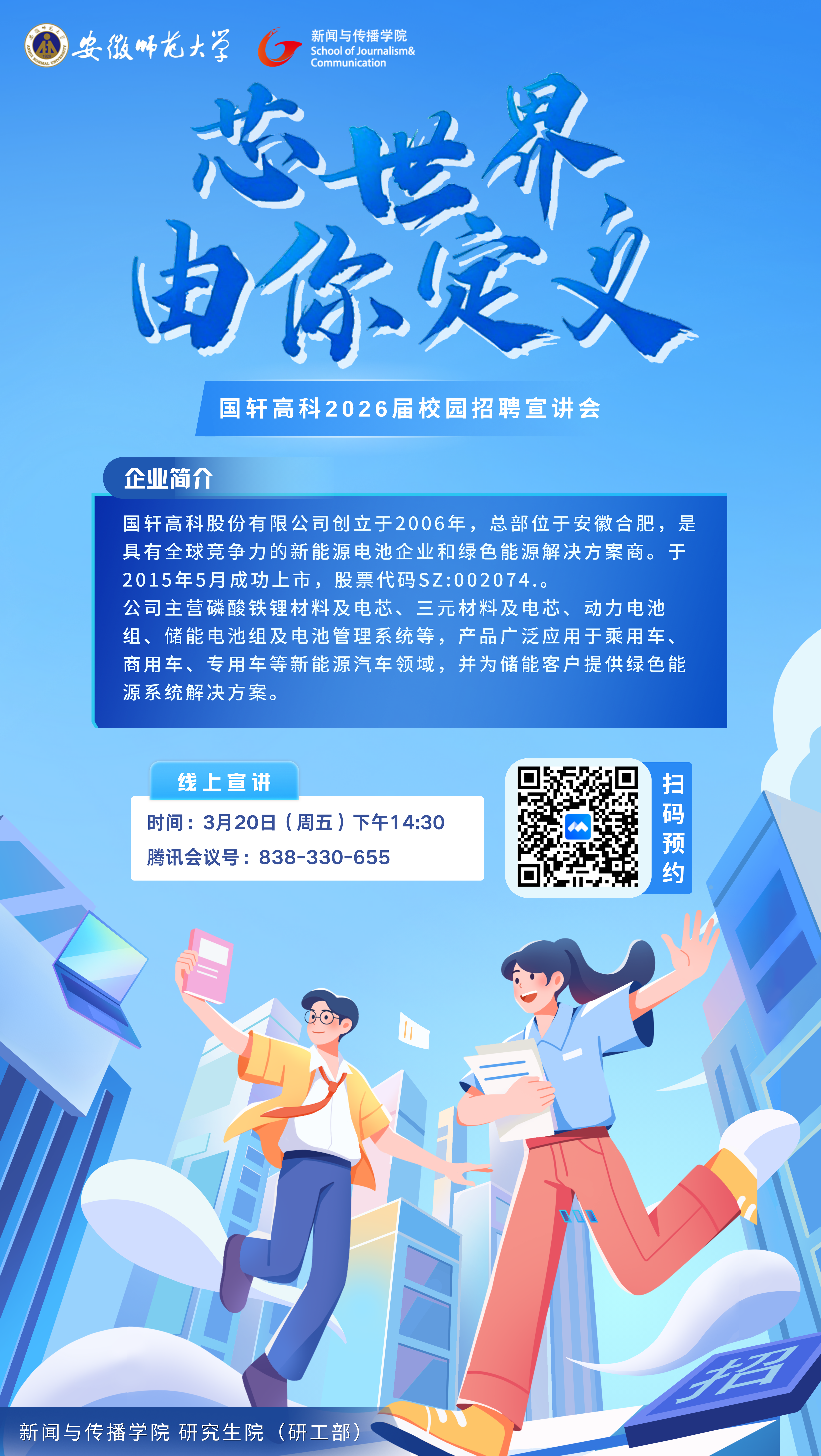 3月20日下午,国轩高科股份有限公司2026届校园招聘线上宣讲会举行。活动由新闻与传播学院与研究生院(研工部)共同组织,研究生院副院长吴青山致辞,国轩高科人力资源部张飞龙主讲,2026届毕业生及部分低年级学生在线参与。
