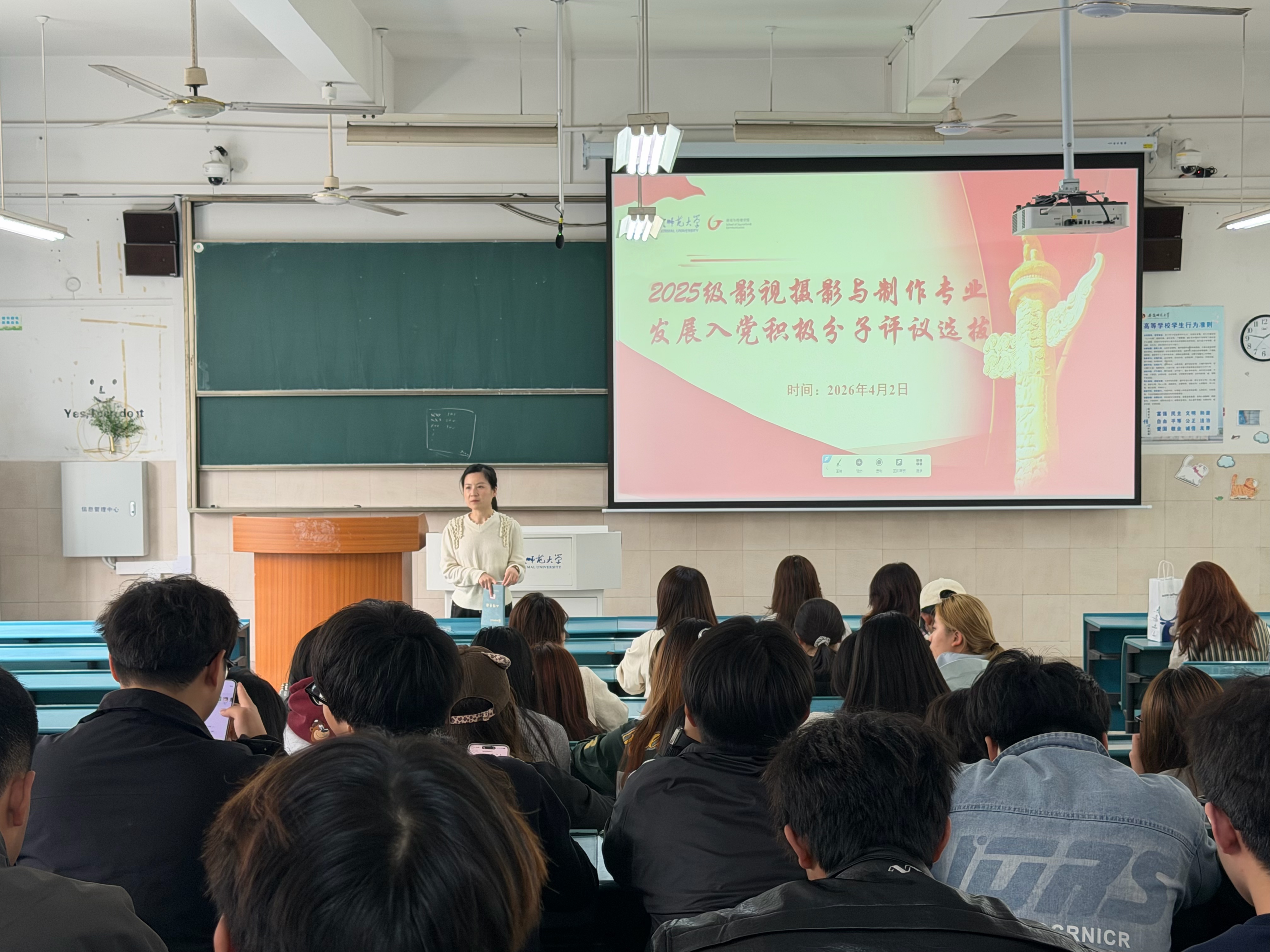 在辅导员郑慧玲的主持下,播音与主持艺术、影视摄影与制作、网络与新媒体三个班在课余时间完成了此项工作。各班评议均严格遵循组织程序,首先由郑慧玲老师阐明选拔标准与意义,引导同学们端正入党动机。