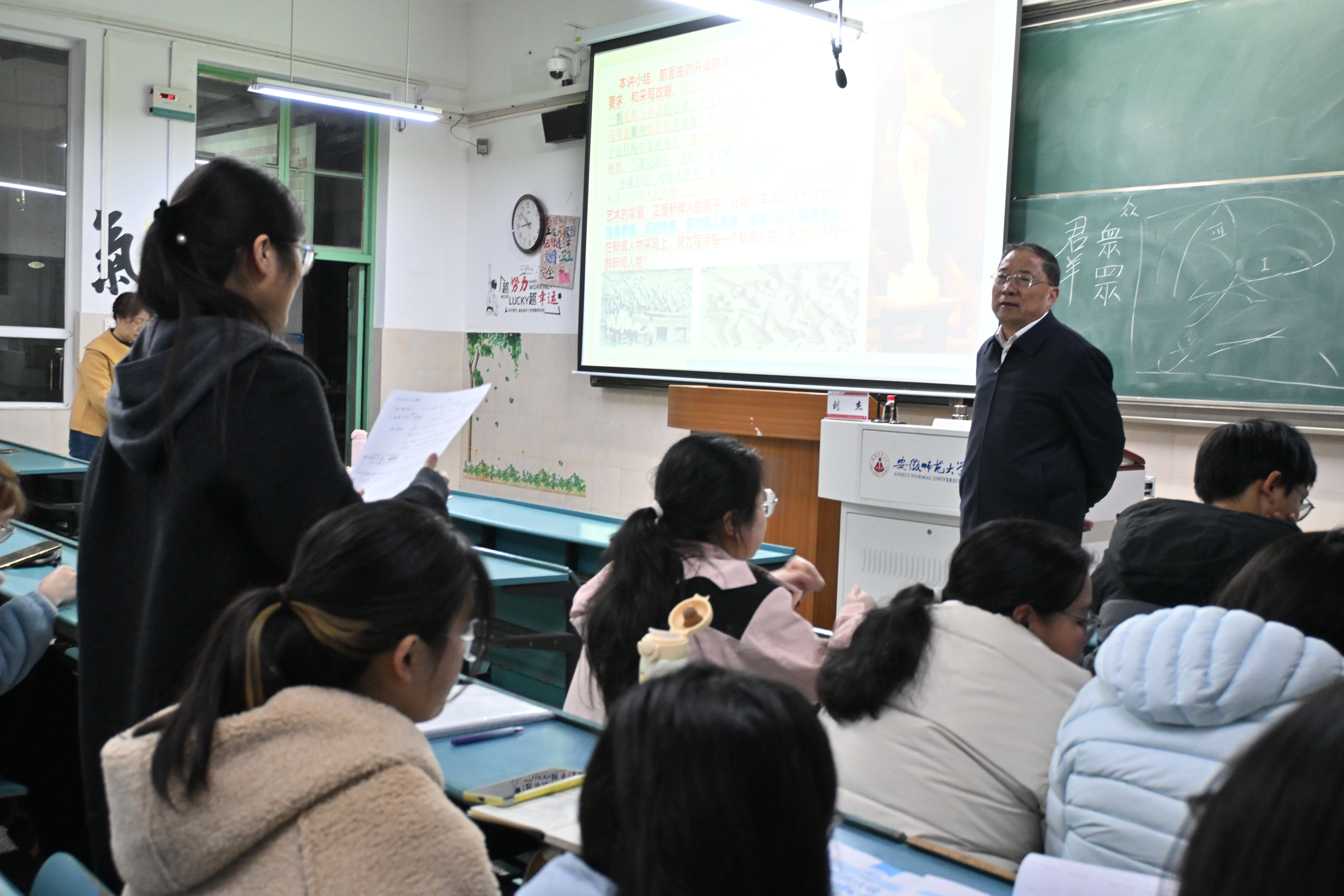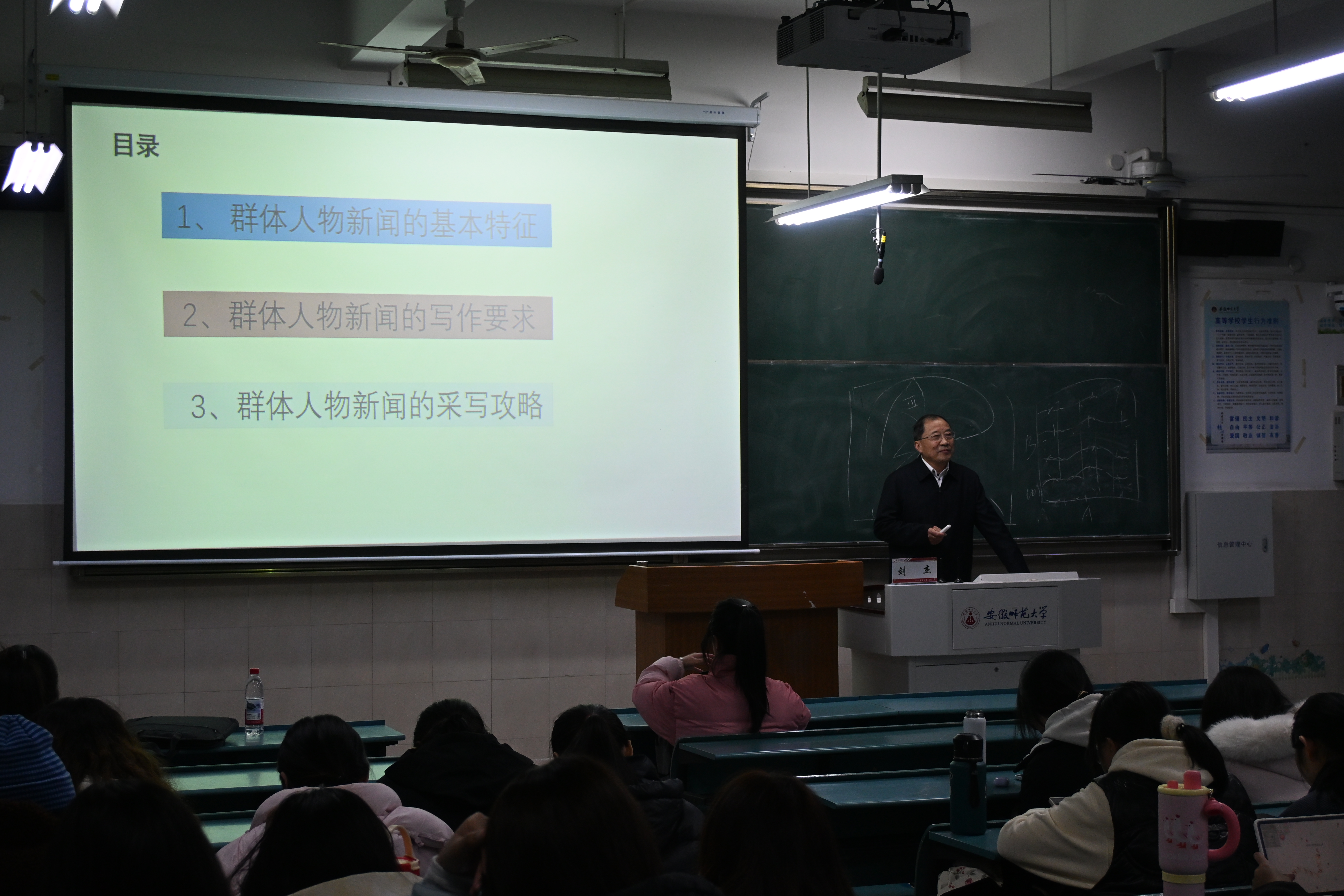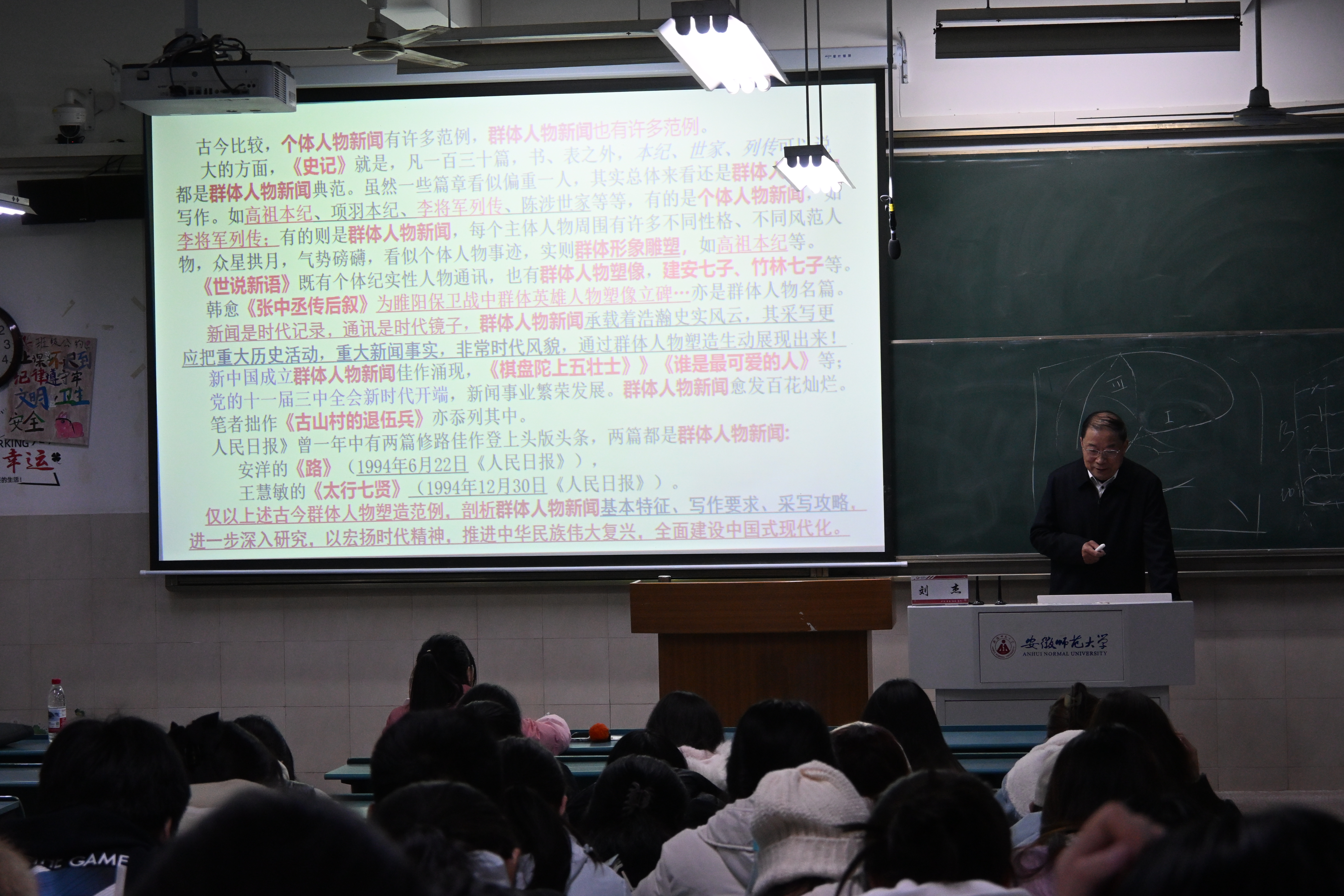 3月19日至20日,新闻与传播学院品牌系列活动“刘杰新闻故事汇—国学与新闻写作系列”第四讲《古今比较,如何写好新闻人物》,在行知楼2040201教室顺利开讲。课程由我校特聘教授、人民日报安徽分社原社长、高级记者刘杰主讲,院长助理、新闻学专业负责人张荻及各年级本科生、研究生到场学习,在思想交流与碰撞中收获新知。